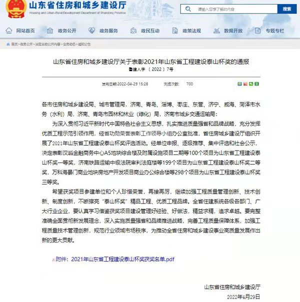东城田园第一园A区1号楼荣获2021年 “山东省工程建设泰山杯奖”