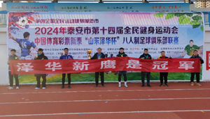 12月22日,2024泰安市第十四届全民健身运动会暨中国体育彩票新泰“山东泽华杯”八人制足球俱乐部联赛”在新泰市体育中心落下帷幕。